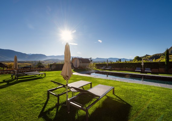 - Liegewiese mit Liegestühlen und Sonnenschirm