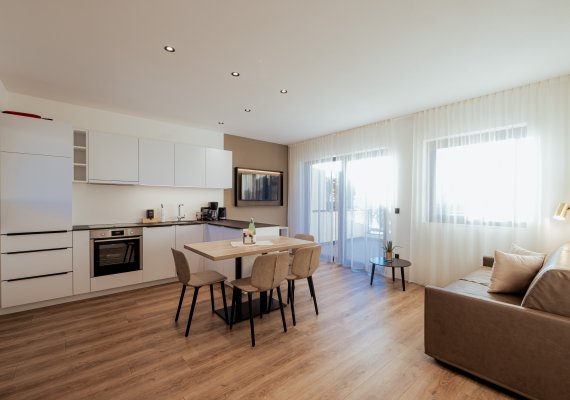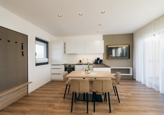 Auf 44 m² Wohnfläche erwartet Sie ein eleganter Wohnraum mit moderner Küche, ein edles Doppelzimmer aus Zirbenholz mit Holzoben, ein ausziehbares Sofa sowie ein stilvolles Bad. Die großzügige Terrasse mit 20m² lädt zum Entspannen und Genießen ein.