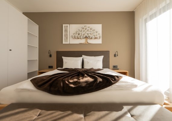 - Schlafzimmer mit Zirbenholz und hochwertigem Holzboden