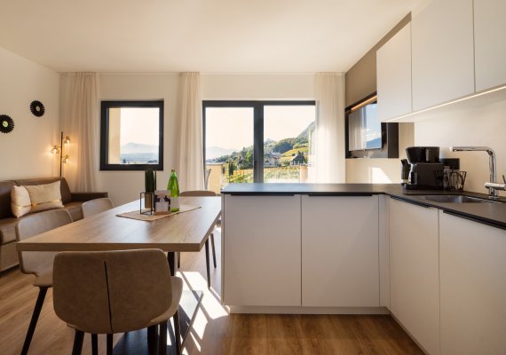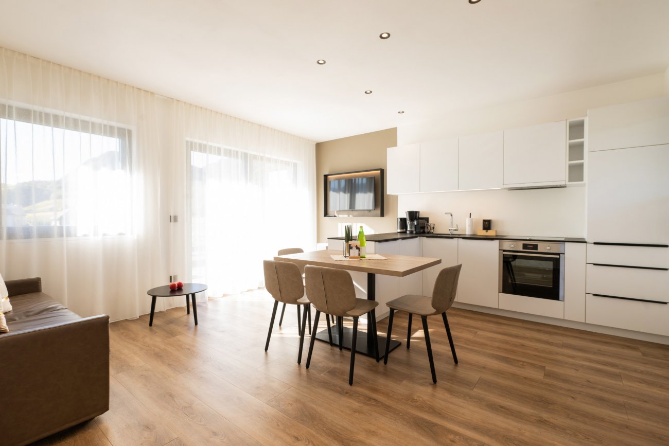 Auf 44 m² Wohnfläche erwartet Sie ein eleganter Wohnraum mit moderner Küche, ein edles Doppelzimmer aus Zirbenholz mit Holzoben, ein ausziehbares Sofa sowie ein stilvolles Bad. Die großzügige Terrasse mit 20m² lädt zum Entspannen und Genießen ein.