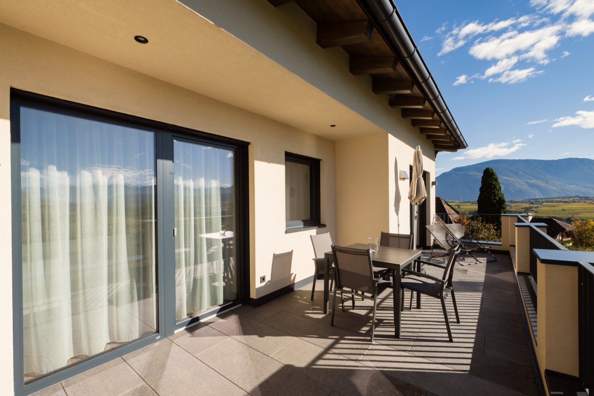 L‘appartamento Valeria per 2-4 persone con ingresso indipendente al primo piano. Con vista panoramica, superficie abitabile di 44 m², terrazza coperta di 20 m² e dotato di: